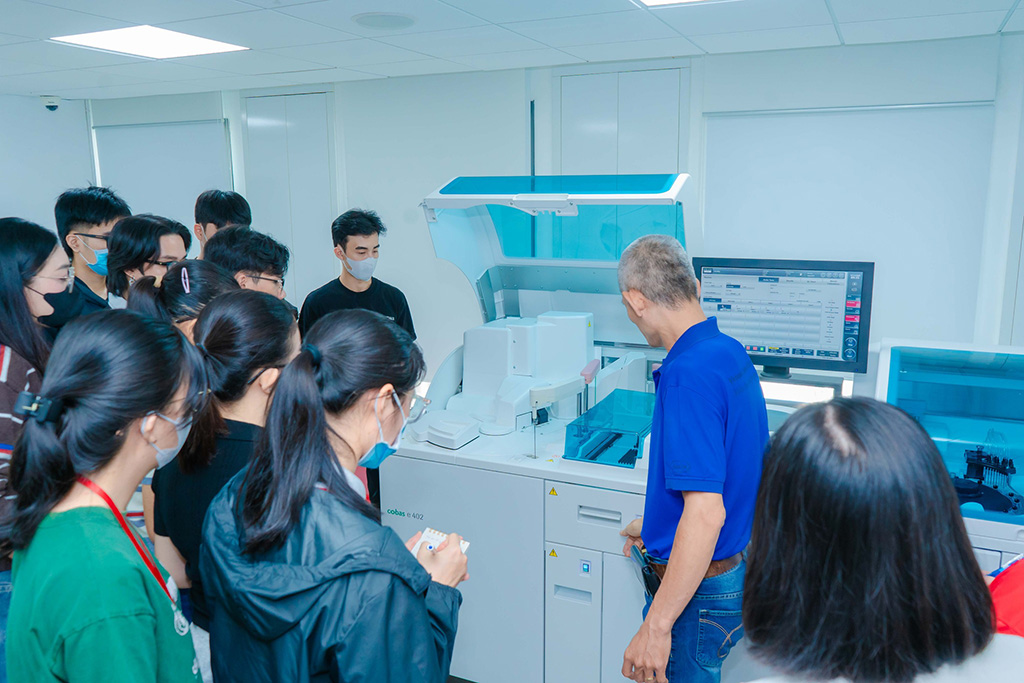 Dưới sự hướng dẫn của ông Phạm Trọng Tiến – Giám đốc Trung tâm Huấn luyện Chẩn đoán Kiểu mẫu Roche, sinh viên có cơ hội tiếp cận các công nghệ xét nghiệm sinh hóa – miễn dịch tiên tiến như kỹ thuật điện hóa phát quang, các dòng máy phân tích tự động và hệ thống xét nghiệm hoàn toàn tự động (Automation), những công nghệ đang được triển khai tại nhiều cơ sở y tế lớn tại TP.HCM và trên cả nước.