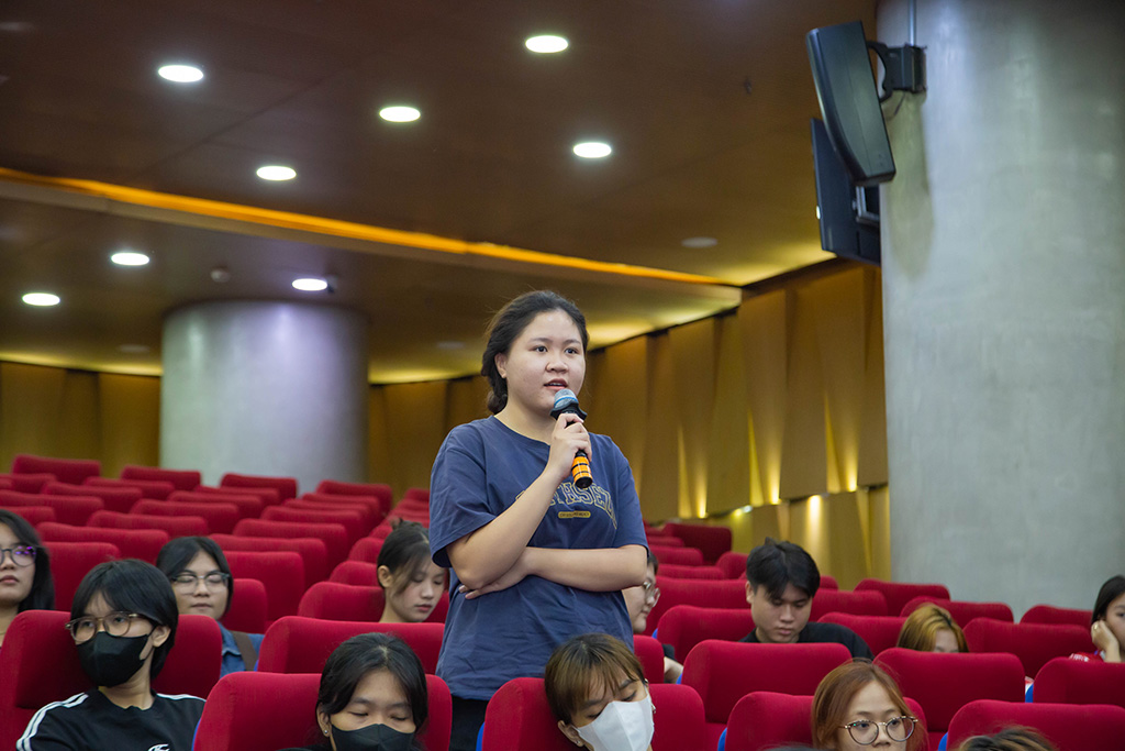 Anh Mai - Sinh viên Khoa Khoa học Xã hội đặt câu hỏi cho diễn giả Đàm Hà Phú