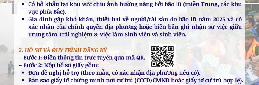 – Gia đình có hoàn cảnh khó khăn bị thiệt hại về người hoặc tài sản do bão, lũ trong năm 2025, có xác nhận của chính quyền địa phương hoặc biên bản ghi nhận sự việc giữa Trung tâm Trải nghiệm & Việc làm Sinh viên với Sinh viên.
