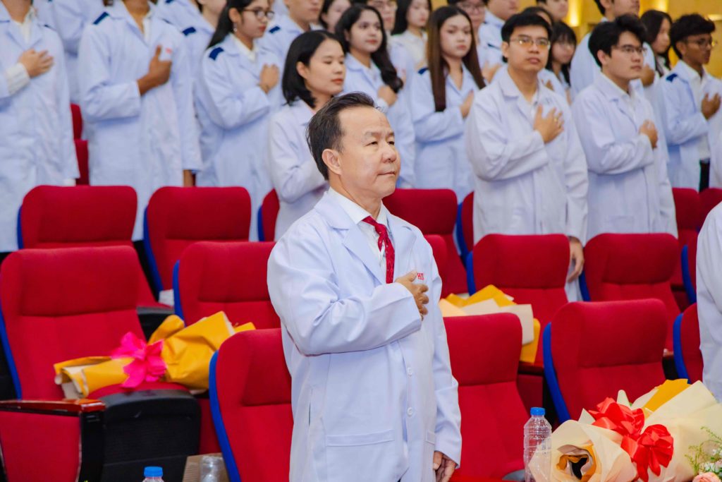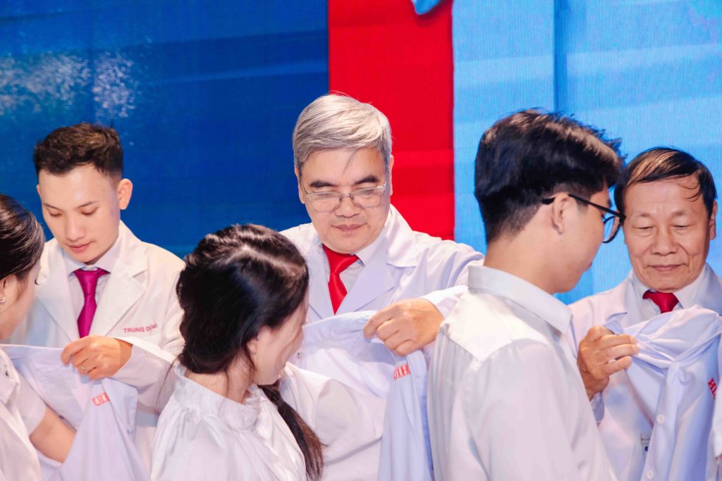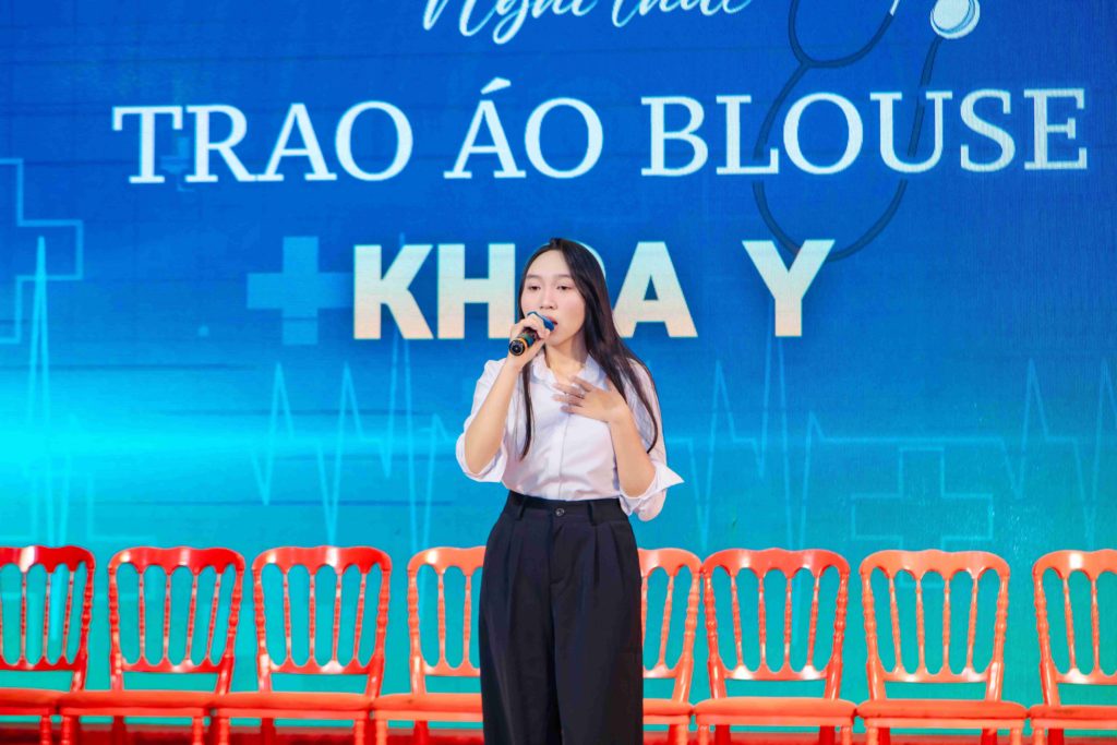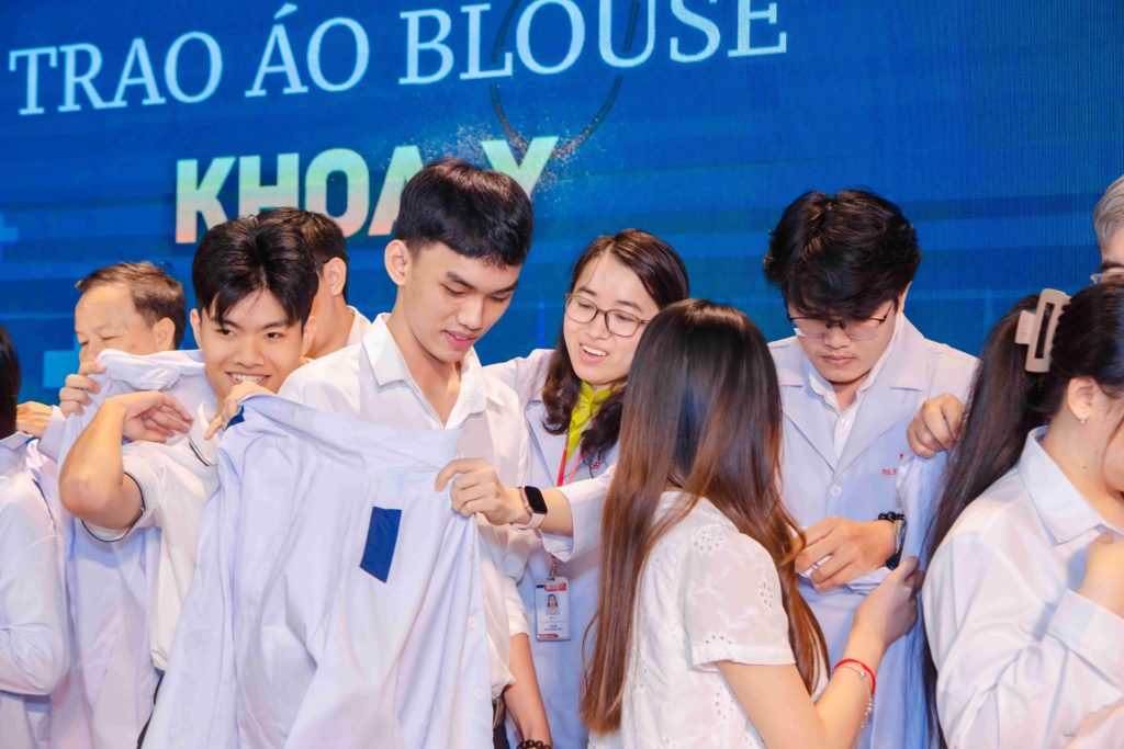 Tiếp nối những lời chia sẻ đầy ý nghĩa, buổi lễ bước vào phần được mong đợi nhất: nghi thức trao áo blouse trắng cho sinh viên năm thứ 2 Khoa Y. Trong không khí trang nghiêm, từng sinh viên lần lượt được xướng tên và bước lên sân khấu, đón nhận chiếc áo trắng từ thầy cô như đón nhận một dấu mốc trưởng thành trên hành trình học tập. Khoảnh khắc chiếc áo được khoác lên vai không chỉ là niềm tự hào của mỗi bạn, mà còn là lời nhắc nhở nhẹ nhàng về trách nhiệm của người học y: học tập nghiêm túc, rèn luyện kỹ năng vững vàng và luôn giữ gìn y đức trong từng hành động. Ánh mắt rạng rỡ, nụ cười xen lẫn chút hồi hộp của các bạn sinh viên đã làm hội trường như lắng lại để chứng kiến một thế hệ tương lai của ngành y đang bắt đầu bước đi bằng sự tự tin, kỷ luật và lòng nhân ái.