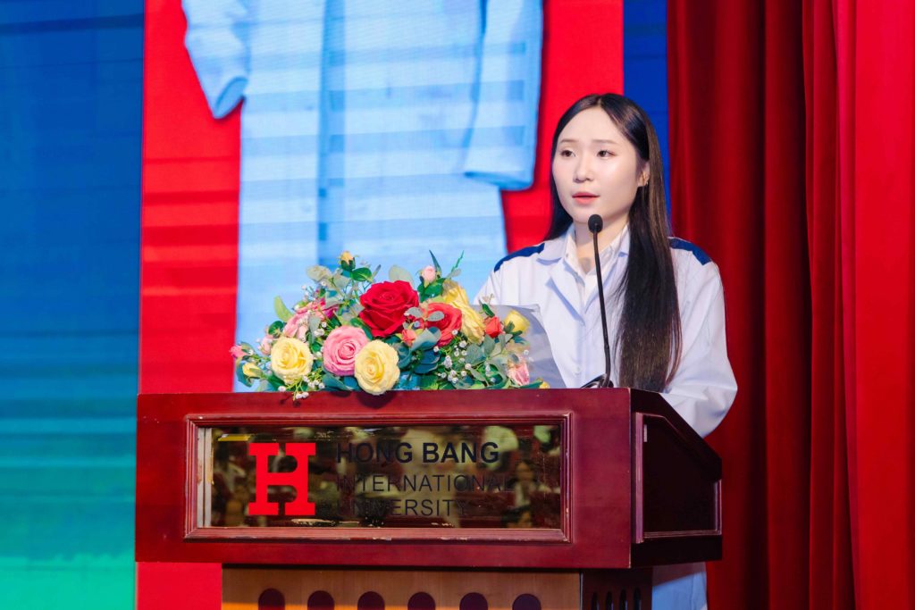 Sau nghi thức trao áo trang trọng, chương trình tiếp tục với phần phát biểu của đại diện sinh viên – bạn Kỳ Thùy An, mang đến những cảm xúc gần gũi và chân thành từ chính người trong cuộc. Bằng giọng nói xúc động nhưng đầy quyết tâm, Kỳ Thùy An đã bày tỏ niềm tự hào khi được khoác lên mình chiếc áo blouse trắng – biểu tượng của tri thức, trách nhiệm và lòng nhân ái. Bạn cũng gửi lời tri ân đến thầy cô và gia đình vì đã luôn đồng hành, nâng đỡ trên hành trình học tập. Đặc biệt, trong lời hứa dành cho chiếc áo trắng, bạn nhấn mạnh quyết tâm học tập nghiêm túc, rèn luyện tác phong chuẩn mực, giữ vững y đức, và không ngừng nỗ lực để xứng đáng với niềm tin mà thầy cô Khoa Y Trường Đại học Quốc tế Hồng Bàng đã trao gửi trong khoảnh khắc ý nghĩa này.