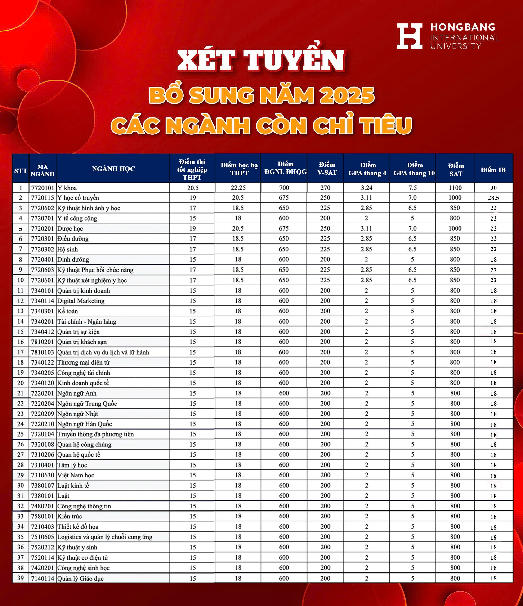 Trường Đại học Quốc tế Hồng Bàng (HIU) thông báo nhận hồ sơ xét tuyển bổ sung đến trước ngày 30/10/2025 cho nhiều ngành đào tạo chính quy. Tân sinh viên trúng tuyển đợt này sẽ được trao học bổng IELTS 60% cùng nhiều quà tặng hấp dẫn.