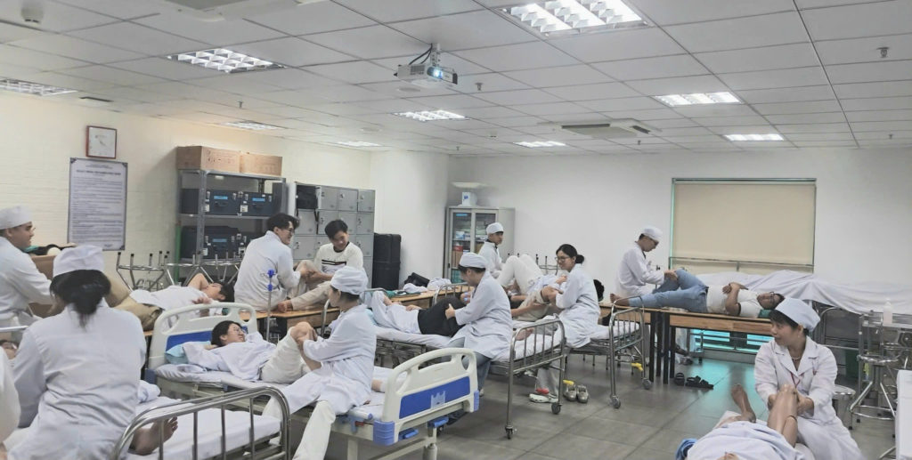 Điểm nổi bật của buổi thực hành là phương pháp học theo cặp/nhóm nhỏ: sinh viên luân phiên đóng vai người bệnh và người khám, tạo cơ hội trải nghiệm cả hai góc nhìn. Nhờ đó, người học không chỉ thực hành thao tác kỹ thuật mà còn cải thiện kỹ năng tương tác, biết cách hỏi bệnh ngắn gọn, phát hiện dấu hiệu bất thường và đưa ra nhận định ban đầu trong các tình huống mô phỏng thường gặp như đau khớp, chấn thương phần mềm, tê bì chi dưới hay giảm tuần hoàn ngoại biên. Dưới sự theo dõi sát sao của giảng viên, từng nhóm được chỉnh sửa trực tiếp về trình tự khám, độ chính xác động tác, thái độ chuyên nghiệp và cách xử trí khi gặp tình huống phát sinh.